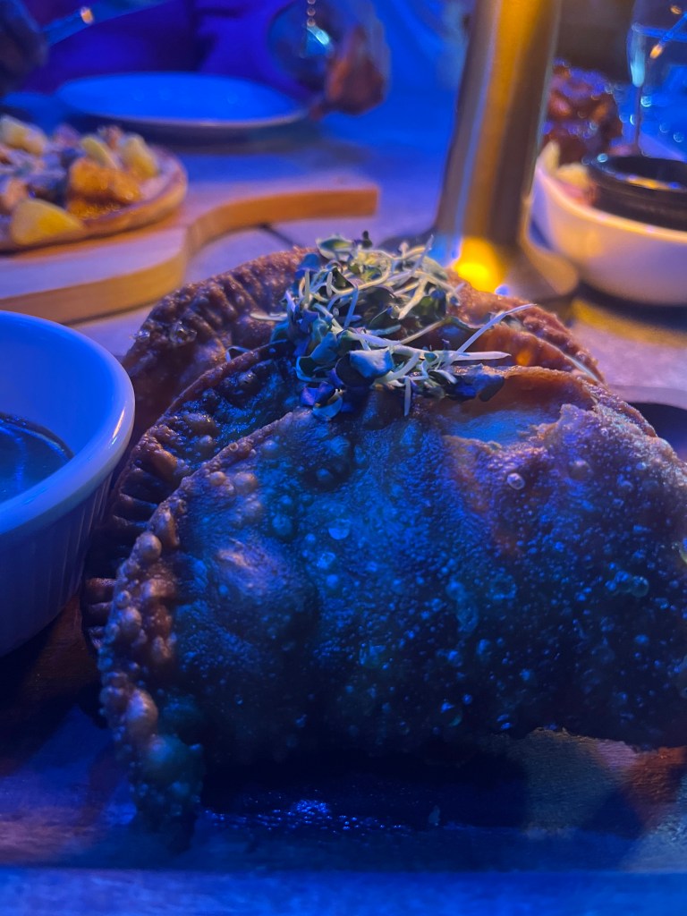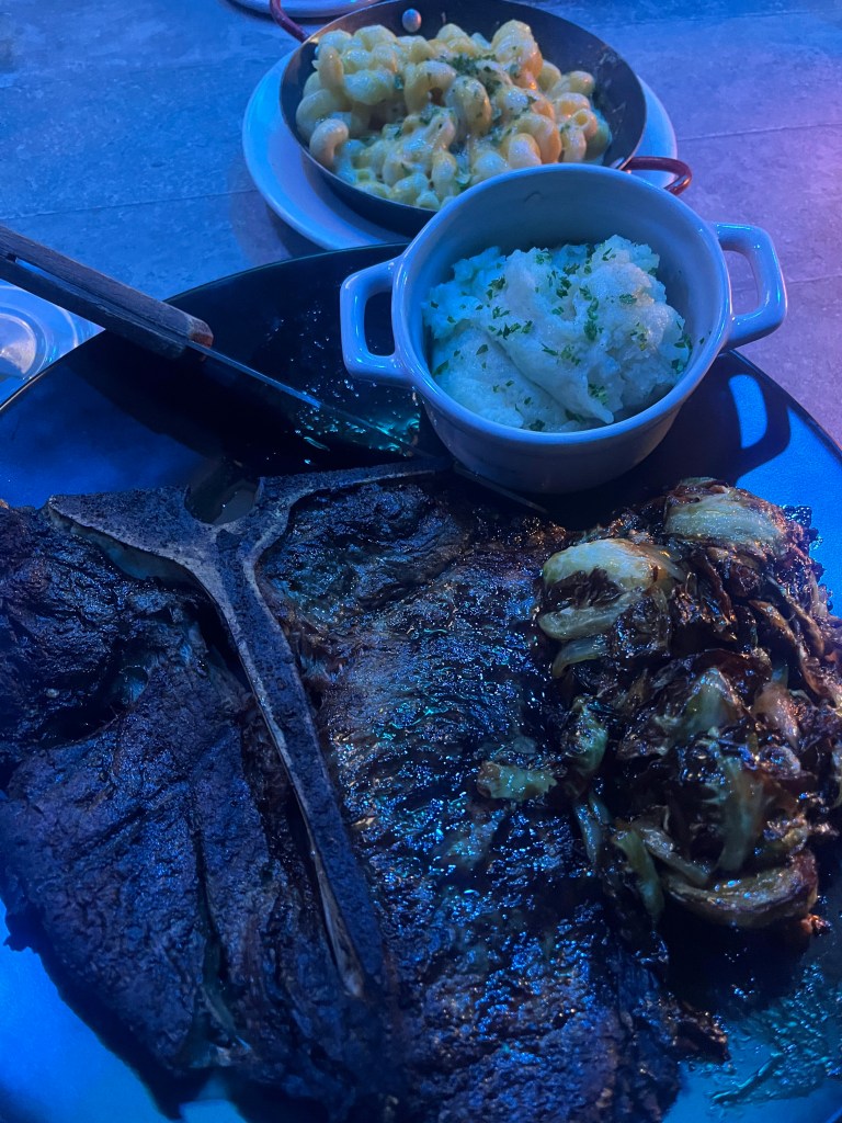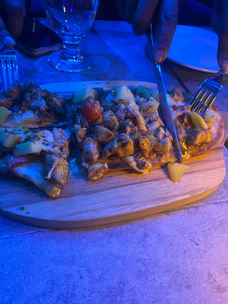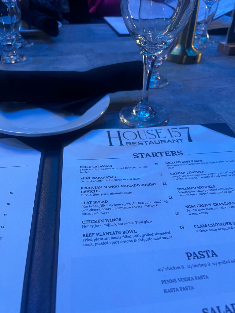 Later on, I went to a restaurant called House 157 with the family. The vibes were nice as afro beats were playing in the background and the lighting was blueish- purple. It was a more formal restaurant as people were dressed in their Sunday best. I ordered steak with mashed potatoes, greens, and a side of mac and cheese. For appetizers, we got empanadas, flat bread, and jerk wings. The food was 7/10.